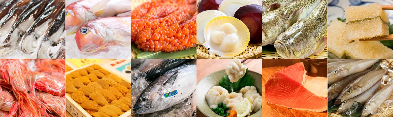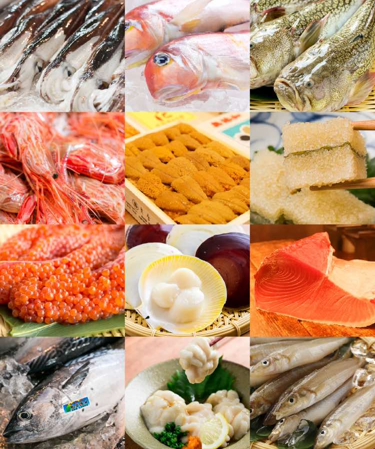 鮮魚、マグロ・カツオ類、貝類、イカ・タコ・エビ・カニ類、ウニ・フグ・アナゴ・肝・海藻類、冷凍魚・冷凍エビ類、干物・漬魚・ちりめん・魚卵・練物類、珍味・惣菜・漬物、調味料・わさび・飾り物 など 3,300 点以上